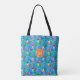This fun and colourful dog pool party tote bag for Parson / Jack Russell Terrier lovers features a pattern of four different JRTs / PRTs with varied brown and black head/body markings and a charming doggy head tilt standing on their colourful blue, pink, orange and lime pool float mats with a tennis ball in a clear blue swimming pool, surrounded by colourful swimming noodles and balls and yellow starfish-shaped floating chew toys - her monogram is customisable on a bright orange circle pendant - Parson / Jack Russell pool party © katz_d_zynes 2021