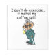 Mildred is a grey haired elderly lady with some pretty strong opinions! On this funny exercise theme design she states "I don't do exercise...it makes my coffee spill."! Humourous exercise theme T-shirts, mugs,bags, cards, stickers, magnets, keychains, ornaments, and more, sure to make yourself and others chuckle!