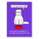 A white fluffy cartoon cat stands in front of a red food bowl asking what time the next meal is.