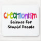 In an appropriate crayon font with bright colours the word "Creationism" stands out above the smaller words "science for stupid people" in black text on light shirts and white on dark shirts.