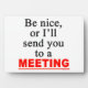 Be Nice or I'll send you to a meeting, snappy, funny saying for assistants, co-workers and secretaries.