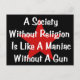 Text says: "A society without religion is like a maniac without a gun." Great to wear when you have to be around the cultists or to greet them at the door when they come pushing their religion.