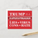 Donald Trump 2020 Superspreader of Lies Virus Cons Hate Anti-Trump postcard. Donald Trump's continued failure to lead has turned a public health emergency into a health and financial crisis for millions of Americans and the small businesses they own and work for. His campaign events are potential super spreader events, and he doesn't care whether the people who are supposed to vote for him actually survive to election day. His entire presidency has been constant lies, tens of thousands according to fact checkers. Everyone in the country deserves better than the cons, the hate, and the chaos that is an integral part of daily life in a Trump government, Vote Biden. Design description: The top quarter is a red background and white serif font reminiscent of Trump's propaganda material. On the red background, the words, "Trump 2020," so it looks like this is going to be a pro-Trump sign (but it's not). Below that, white lines border a darker red strip that reads, "Superspreader" in a white sans serif font. Immediately below the bottom white line in small san serif font is the word "of." In the bottom half, the same lighter red as the top using the same white Trump-like font, reading in very large all cap letters, "Lies, Virus, Cons, Hate," over 2 lines, with a star between the words on each line.