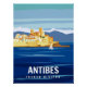 Antibes Fortress French Riviera Retro Poster. Tropical coast scenic view, palm, Mediterranean marine, sea town. Summer vacation holiday nature