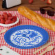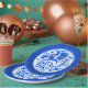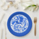 Paper plates in a vintage Jacobean flower pattern adapted from antique Chinese porcelain, in shades of deep cobalt and cerulean blue
