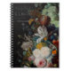 Beautiful floral still life oil painting on dark background with grungy damask and antique script ephemera.