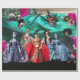 Expressive, whimsical ancient Venetian puppets from !700 , vibrant gorgeous red blue costumes, colourful ,artistic Venetian masks with peacock feathers and blue green teal silk cloth, Original Digital Collage and Graphic Design by Bulgan Lumini - Baldesign3d (c)