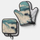 Antique Japanese Blue Waves Ocean Print Oven Mitt & Pot Holder Set