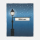 Personalizable design featuring a Victorian era lamp post glowing against a dark blue night sky with stars. There is a sign attached to the street lamp which allows for a custom family last name / surname, for example.
