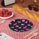 Paper plates in a pattern of assorted antique Christmas tree ornaments, in deep fuchsia pink, teal green, soft gold and violet, against a black background