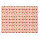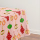 Tablecloth in a pattern of assorted antique Christmas tree ornaments, in deep red, dark green, soft gold and pink, against a soft peach pink background