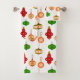 Towel set in a pattern of assorted antique Christmas tree ornaments, in deep red, dark green, soft gold and pink, against a white background