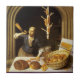 A baker blowing his horn.Flemish oil painting from 1681,of ancient bake shop .This classic design is perfect for nutritionists,dieticians,caterers, food service,preparation or restaurant ,catering ,.