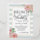 Stylish bridal shower invitation features blush pink watercolor peonies and a sage green striped background with "brunch and bubbly" and your bridal shower details in the centre. Gold foil trim completes the design.