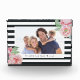 Create a sweet keepsake with our chic floral photo block, featuring your favourite horizontal or landscape orientated photo framed by a charcoal off-black and white stripes and accented with clusters of blush pink watercolor peony flowers and sage green leaves. Add your custom message using the field provided; we love it with "We Love You Mum" and the year for a unique Mother's Day, birthday or new mum gift.
