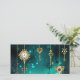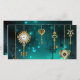 Gold, antique keys with gears and dials hang on gold chains on luminous green background.
