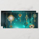 Gold, antique keys with gears and dials hang on gold chains on luminous green background.
