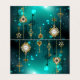 Gold, antique keys with gears and dials hang on gold chains on luminous green background.