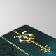 Gold, antique keys with gears and dials hang on gold chains on luminous green background.