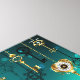 Gold, antique keys with gears and dials hang on gold chains on luminous green background.