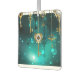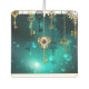 Gold, antique keys with gears and dials hang on gold chains on luminous green background.