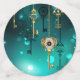 Gold, antique keys with gears and dials hang on gold chains on luminous green background.