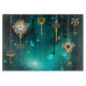 Gold, antique keys with gears and dials hang on gold chains on luminous green background.