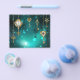 Gold, antique keys with gears and dials hang on gold chains on luminous green background.