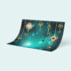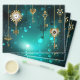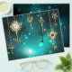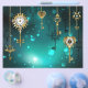 Gold, antique keys with gears and dials hang on gold chains on luminous green background.
