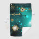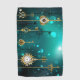 Gold, antique keys with gears and dials hang on gold chains on luminous green background.