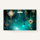 Gold, antique keys with gears and dials hang on gold chains on luminous green background.