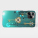Gold, antique keys with gears and dials hang on gold chains on luminous green background.