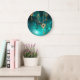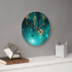 Gold, antique keys with gears and dials hang on gold chains on luminous green background.