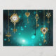 Gold, antique keys with gears and dials hang on gold chains on luminous green background.