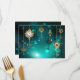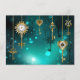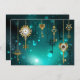 Gold, antique keys with gears and dials hang on gold chains on luminous green background.