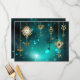 Gold, antique keys with gears and dials hang on gold chains on luminous green background.