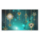 Gold, antique keys with gears and dials hang on gold chains on luminous green background.