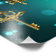 Gold, antique keys with gears and dials hang on gold chains on luminous green background.
