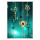 Gold, antique keys with gears and dials hang on gold chains on luminous green background.