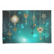 Gold, antique keys with gears and dials hang on gold chains on luminous green background.
