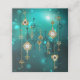 Gold, antique keys with gears and dials hang on gold chains on luminous green background.