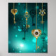 Gold, antique keys with gears and dials hang on gold chains on luminous green background.