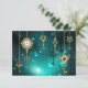 Gold, antique keys with gears and dials hang on gold chains on luminous green background.