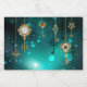 Gold, antique keys with gears and dials hang on gold chains on luminous green background.