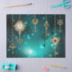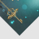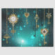 Gold, antique keys with gears and dials hang on gold chains on luminous green background.