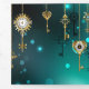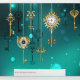 Gold, antique keys with gears and dials hang on gold chains on luminous green background.
