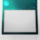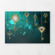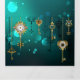 Gold, antique keys with gears and dials hang on gold chains on luminous green background.
