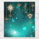 Gold, antique keys with gears and dials hang on gold chains on luminous green background.