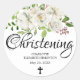 White watercolor roses nestled in sage green leaves create a beautiful floral pattern. A small black cross is placed at the bottom of the christening sticker. The word Christening is written in a large flowing script. The name is written in a simple font. The first name is on the top and the middle and family name is on the second. The date follows.