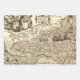 Three sections of an antique map of the continents on the Atlantic Ocean featuring numerous sea monsters and sailing ships, and even Poseidon himself, travelling in the sea, showing the earliest cartography of locations in North and South America.